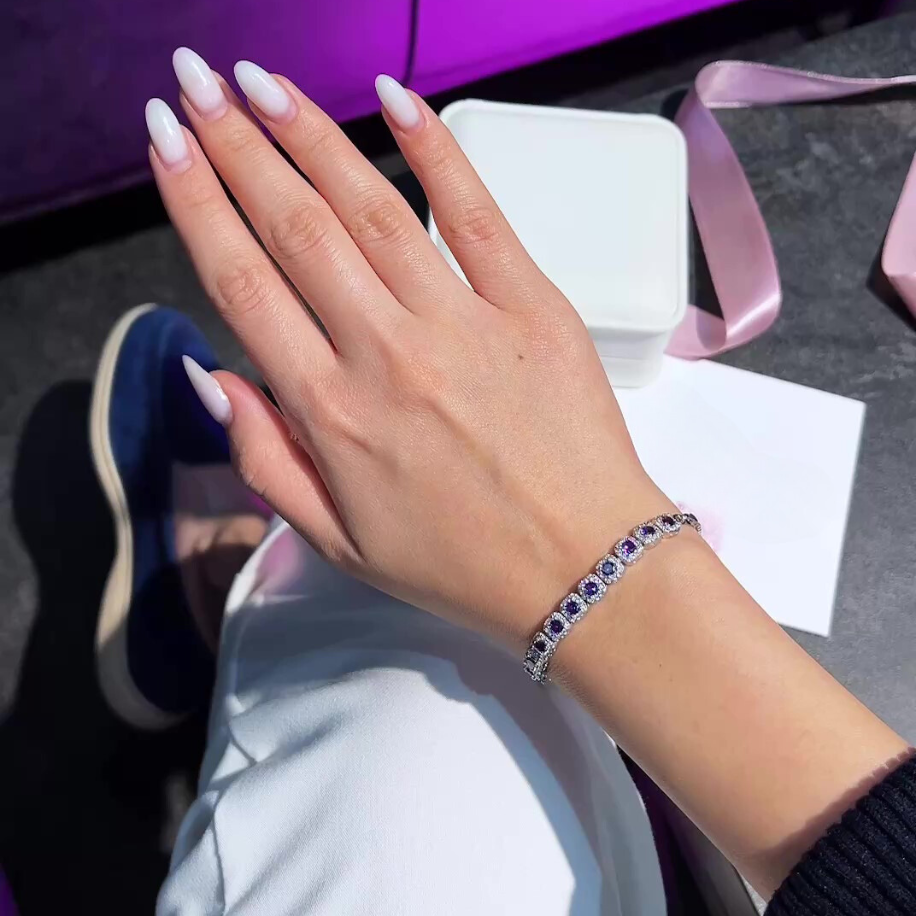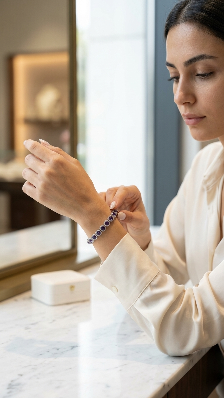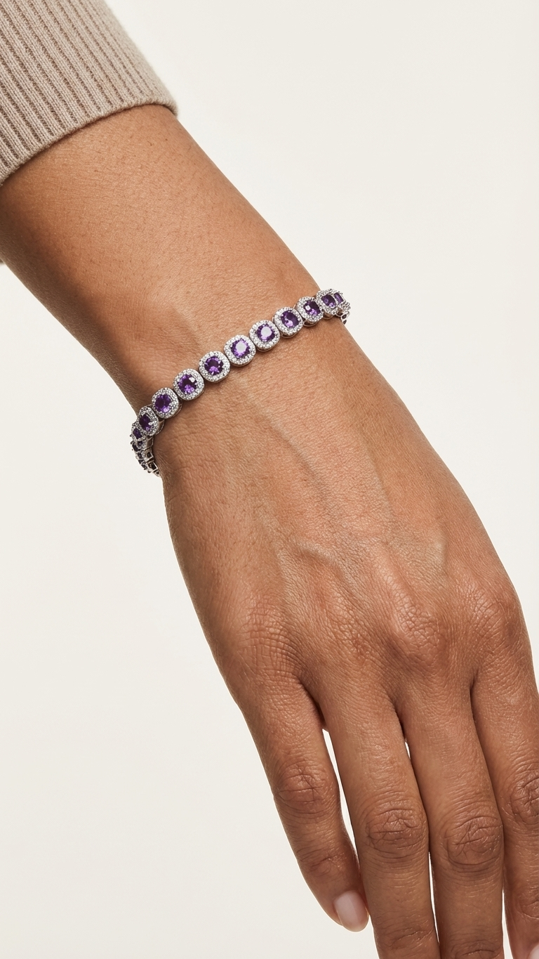Seçkin Ametist İşçiliği: Bileklik üzerinde konumlandırılan mor taşlar, ışığı optimal düzeyde kırarak dikkat çekici ancak zarif bir ışıltı yayar.