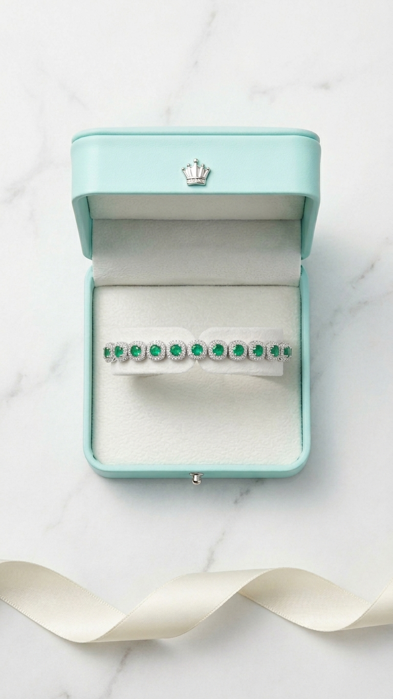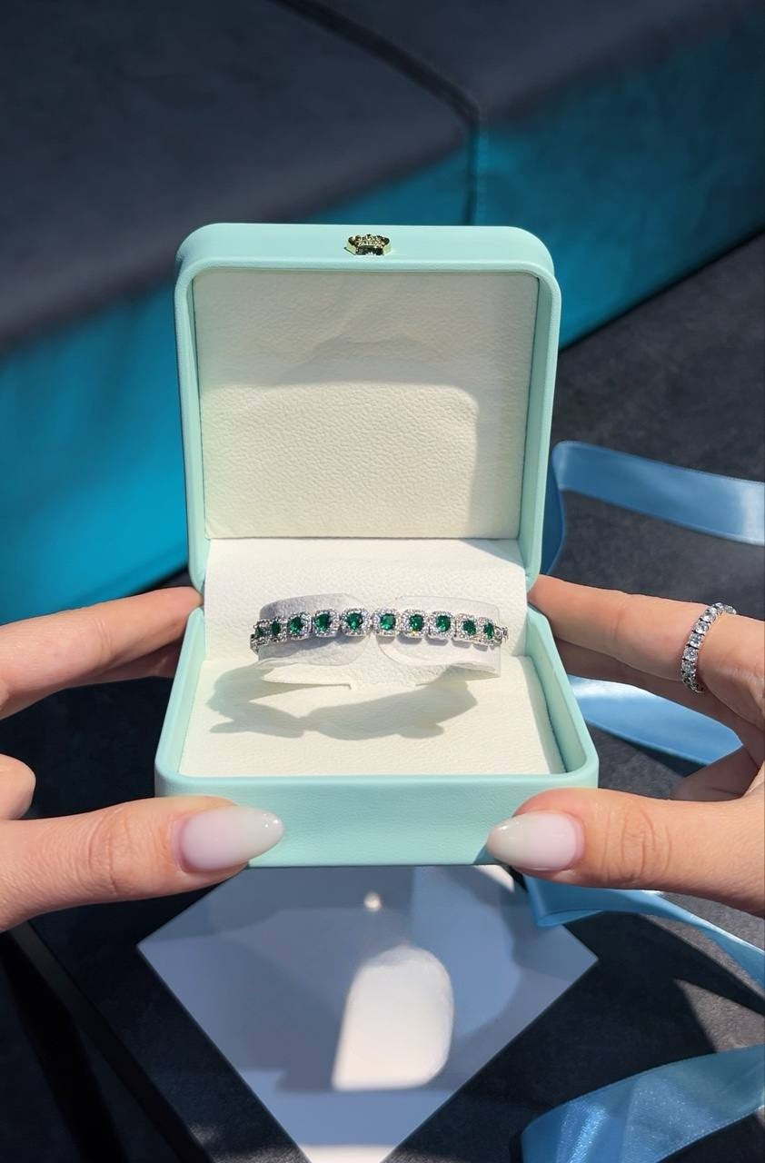 Seçkin Zümrüt İşçiliği: Bileklik üzerinde konumlandırılan yeşil taşlar, ışığı optimal düzeyde kırarak dikkat çekici ancak zarif bir ışıltı yayar.
